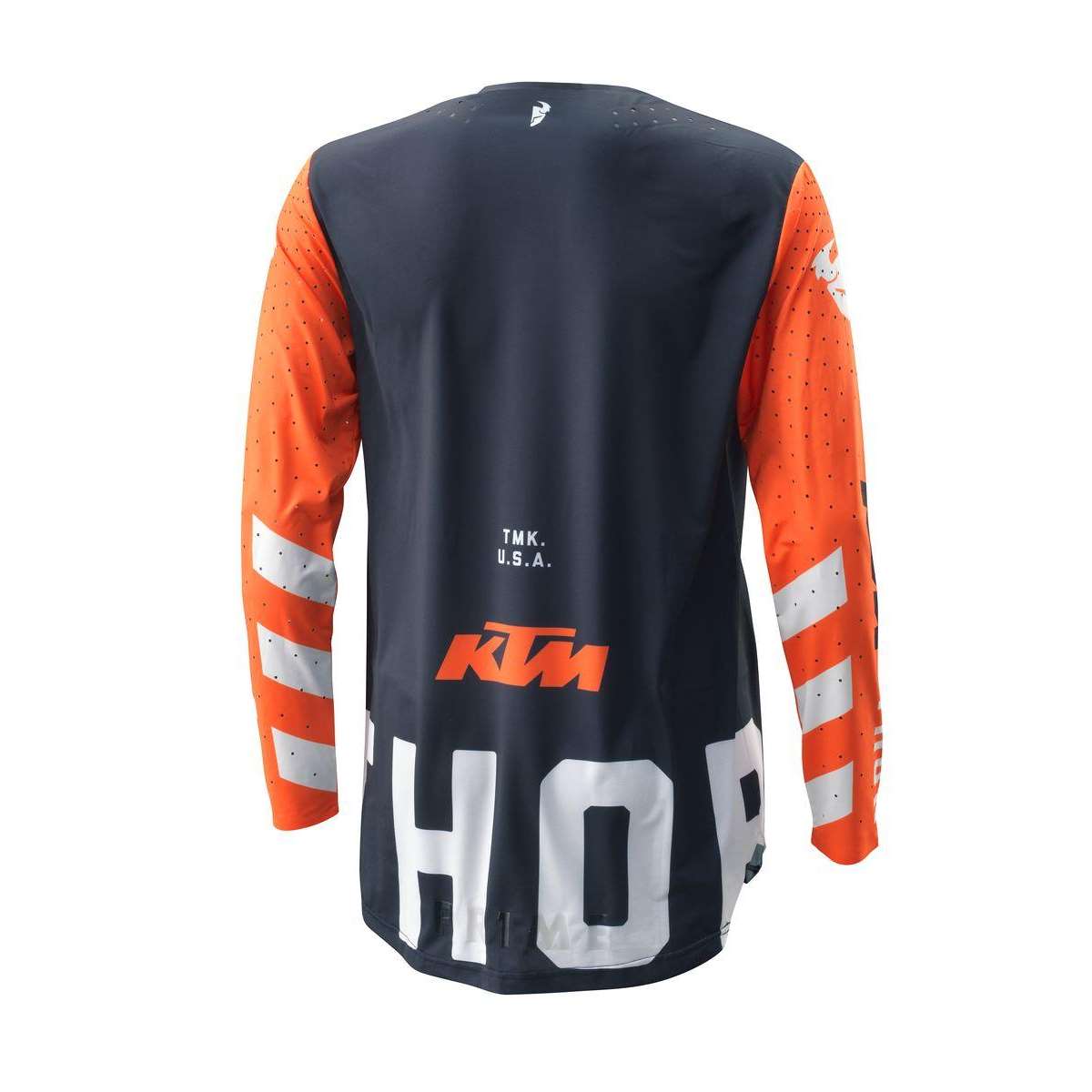 Leichtes Performance-MX-Shirt Exklusiv für KTM von Thor  Perforierte Ventilationszonen Optimale Passform in Fahrposition (vorn kurz, hinten lang) Mesh-Einsätze
