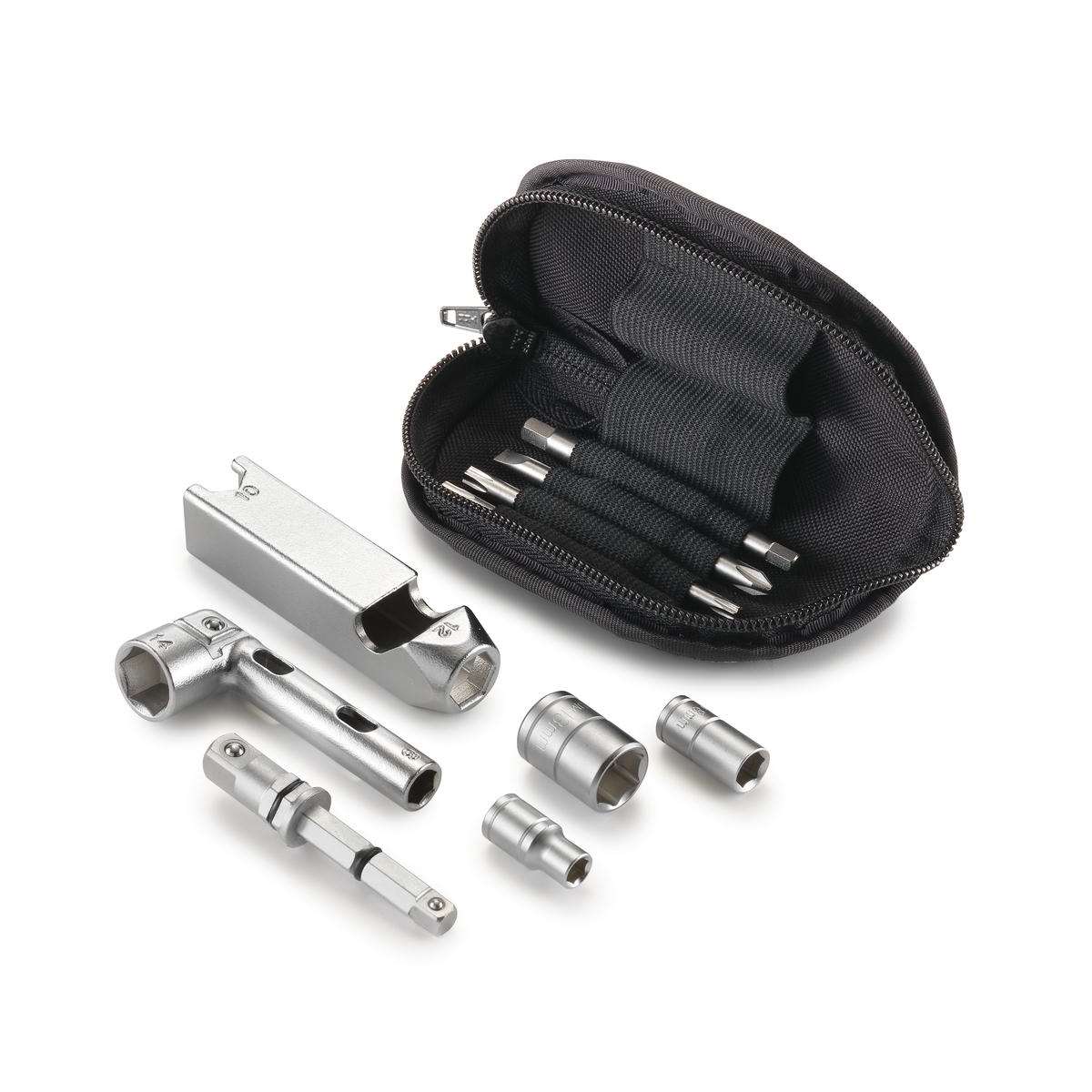 Die perfekte Werkzeugalternative für unterwegs. Praktisch verpackt in einer kleinen Tasche kannst du das Werkzeug für folgende Verschraubungen verwenden: 14, 12, 10, 8 mm Sechskantschlüssel; 6, 8, 13 mm Steckschlüssel; Einsätze für Längsschlitz, Kreuzschlitz, 5 mm/6 mm Innensechskant, 25/30 und 40/45 Torx; Flaschenöffner; Aufsteckmöglichkeit für 3/8" und 1/4" Steckschlüssel.